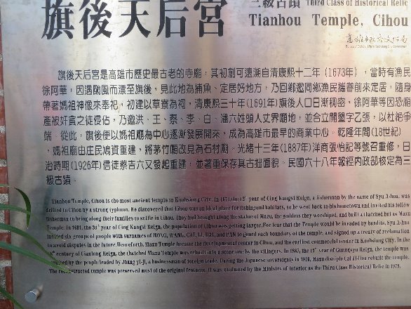 On the island you would also find a Tianhou (Chinese sea godess) Temple and a Presbyterian church, Ki-Au Presbyterian Church - 台灣基督長老教會旗後教會 founded by a missionary doctor James Laidlaw Maxwell , the first church in Taiwan.